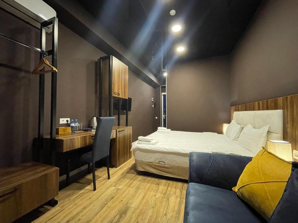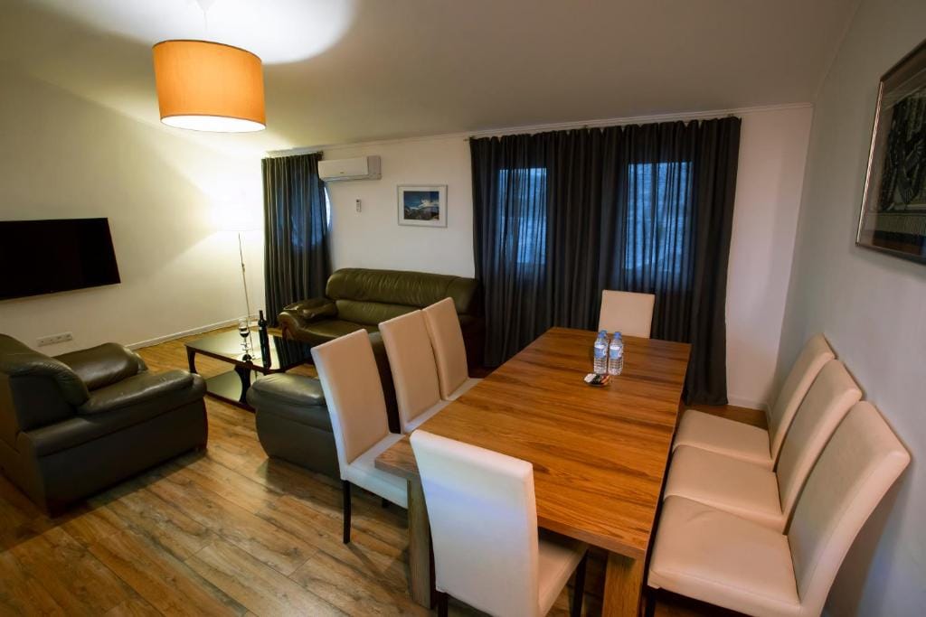 Rooms are well-equipped with air conditioning, a seating area, flat-screen TV with satellite channels, a safety deposit box, and a private bathroom featuring a bidet, complimentary toiletries, and a hairdryer. Selected rooms also include a kitchenette with a fridge, microwave, and stovetop, catering to guests preferring self-catering options. Each room also comes with a closet, ensuring ample storage space.