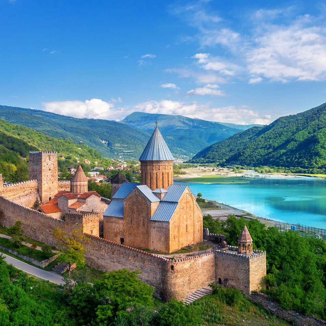 Morning: Depart from Tbilisi and head towards Kazbegi, with a stop at the picturesque Ananuri Fortress, which overlooks the stunning Jinvali Water Reservoir. This historic site offers breathtaking views and a glimpse into Georgia’s medieval past.