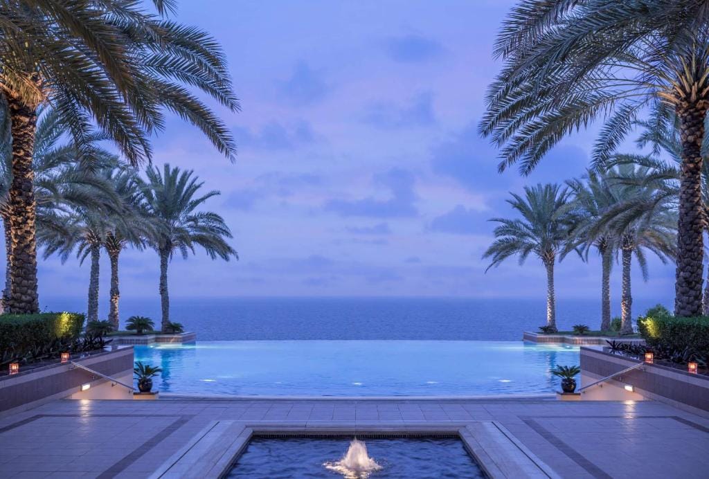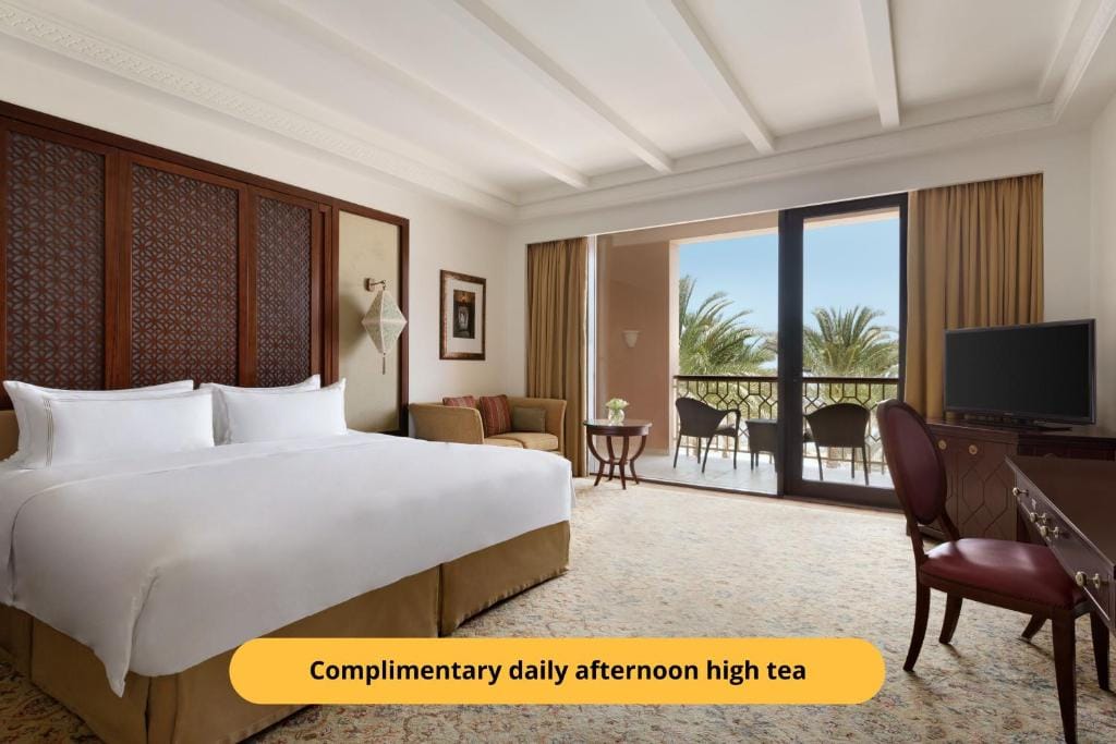 The 180 spacious rooms and suites, adorned with authentic Omani artworks, feature balconies with stunning sea or pool views. Guests enjoy daily restocked mini bars, afternoon tea, and a nightly aperitif hour. Dining experiences include Mediterranean cuisine at Sultanah and contemporary Indian cuisine at Aangan by Rohit Ghai, a Michelin-star venue.